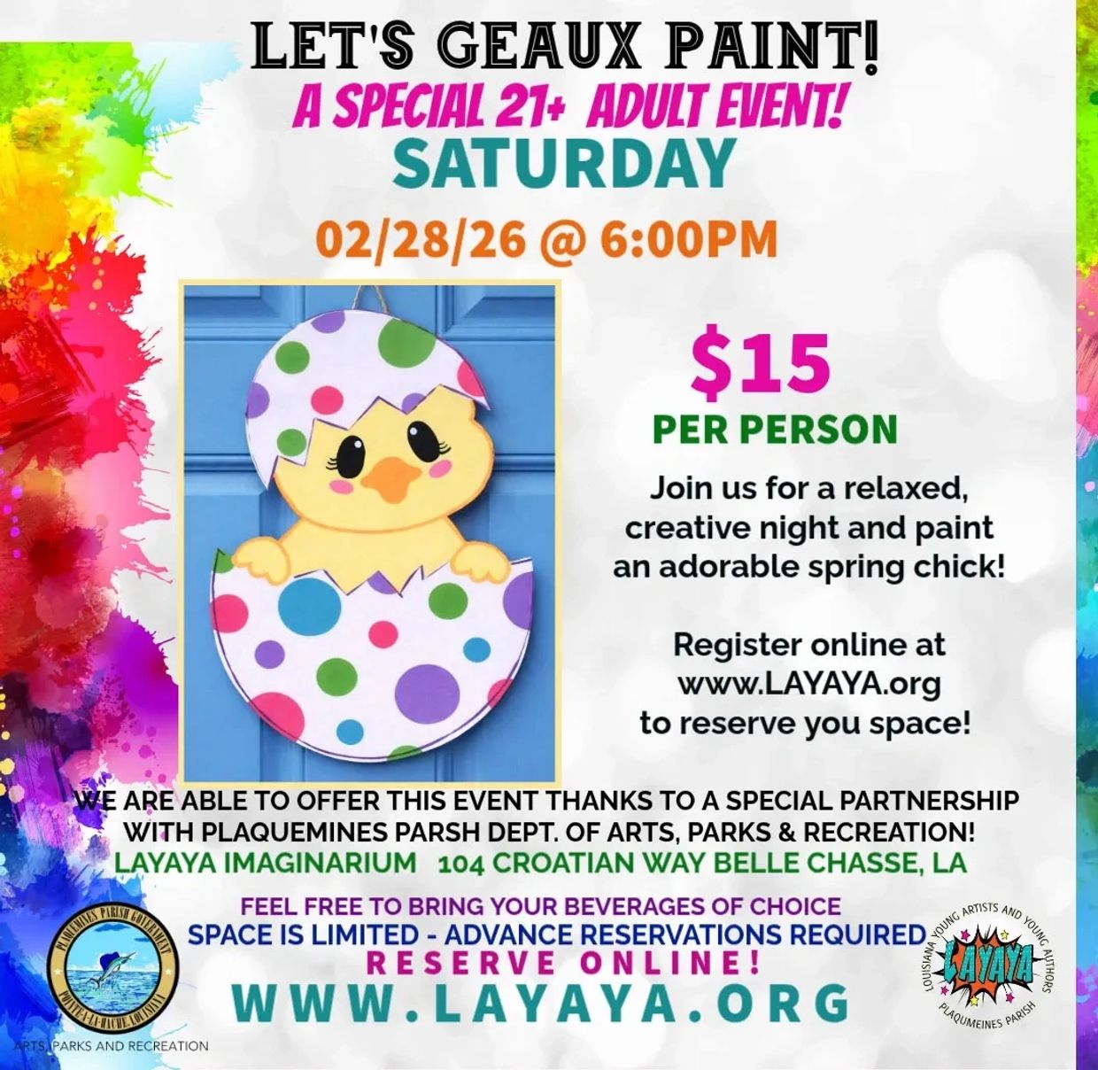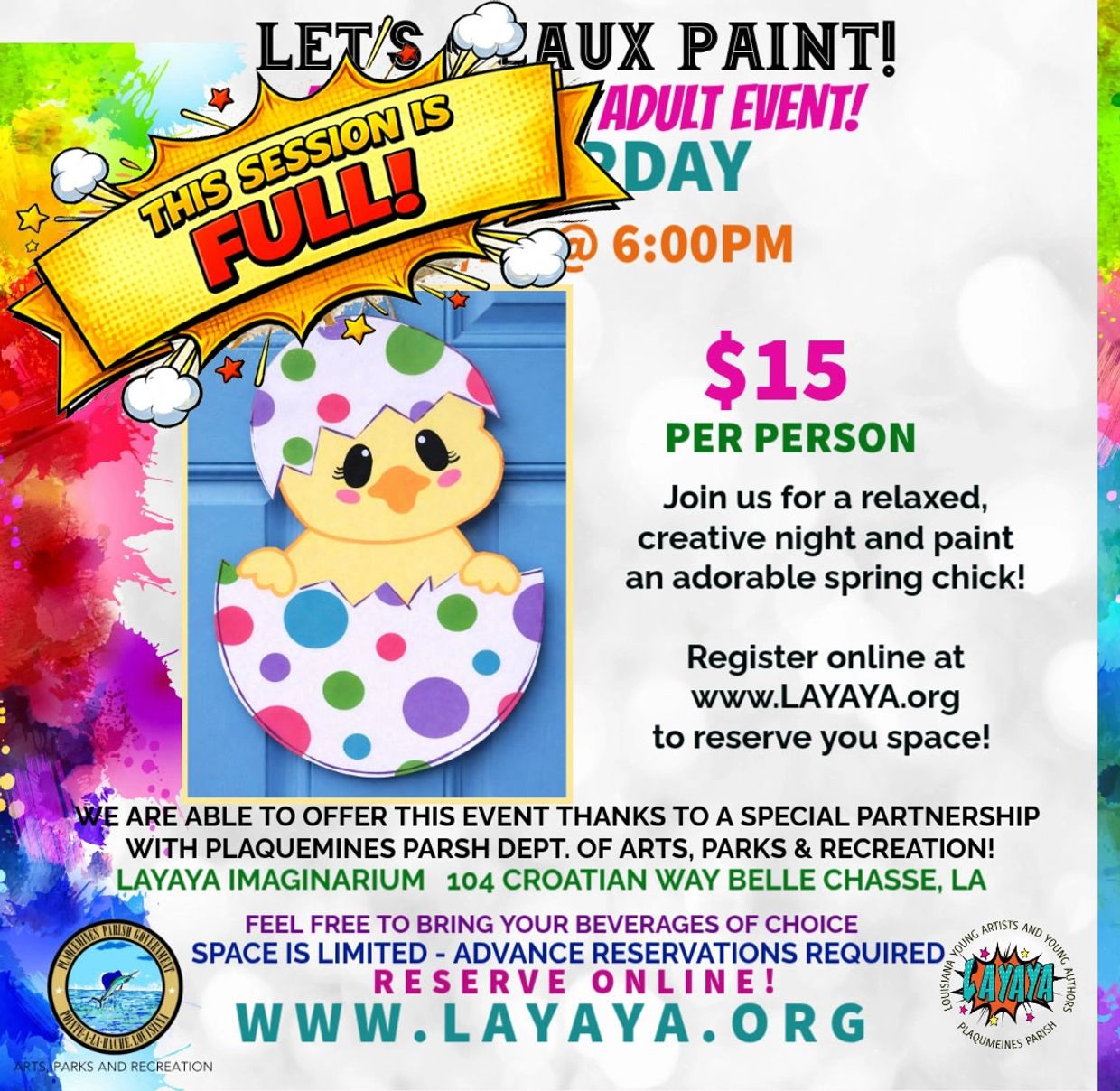 We’ve hatched another fun and creative 21+ event at LAYAYA Imaginarium in partnership with the Plaquemines Parish Department of Arts, Parks & Recreation!